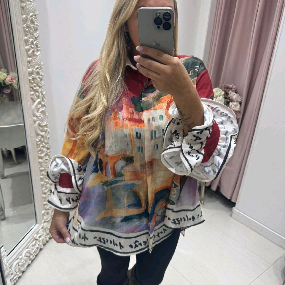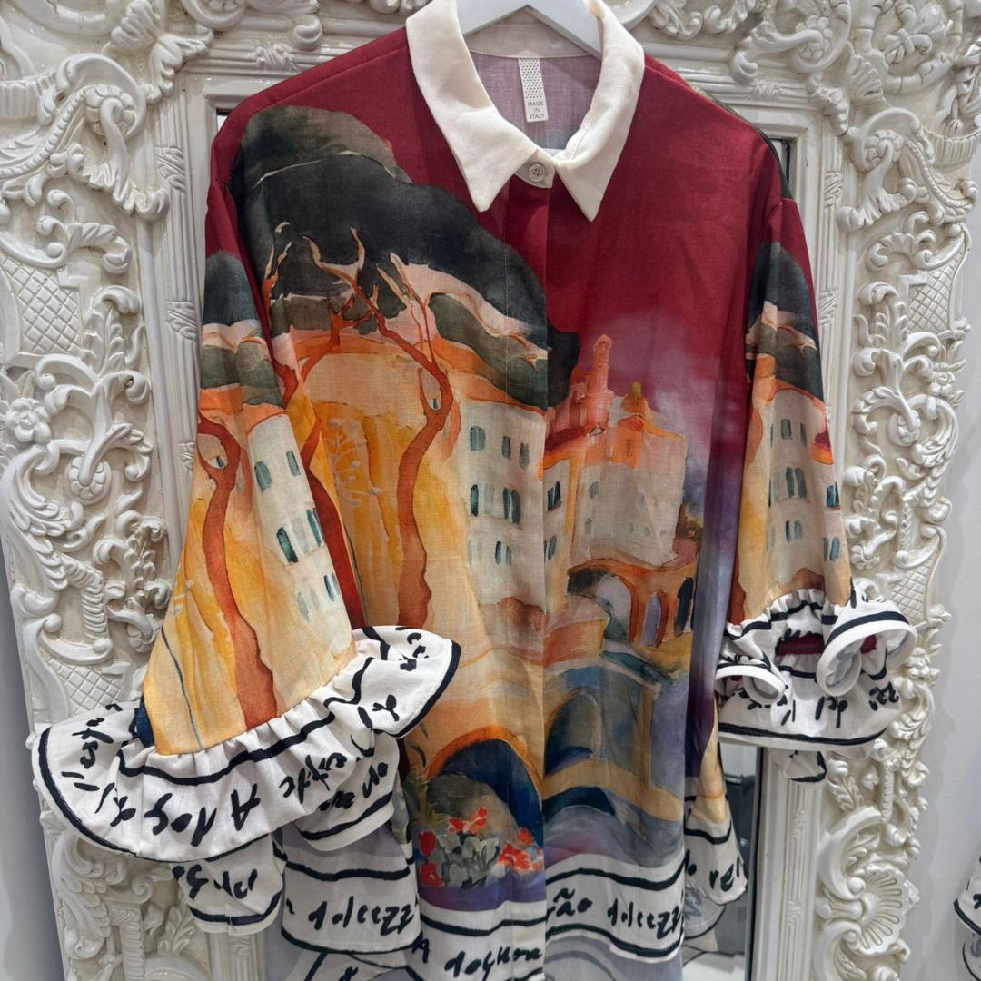 Aurora ~ Vivid Print Shirt With Frilled Arms & Hemline ~ Wine