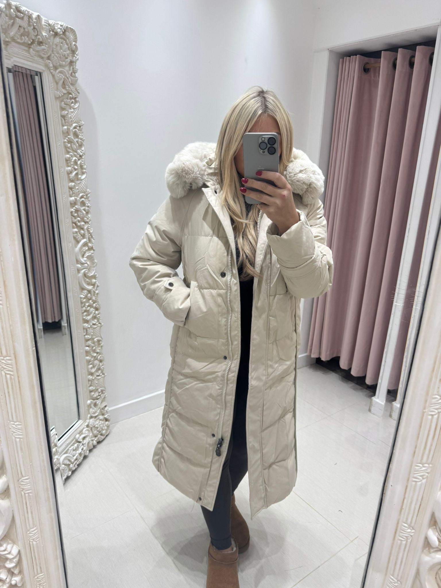 Product form Pretty Dollz Cassie ~ Padded Duvet Coat in Cream Longline Faux Fur Hood Padded Duvet Coat in Cream Functioning Pockets ~ Inside Tie Pull (waist cincher) ~ Stud button... £50.00 Size Size chart Medium - 10-12 Large ~ 12-14 X Large - 14-16 2 in stock Quantity Add to cart Guaranteed secure & safe checkout.