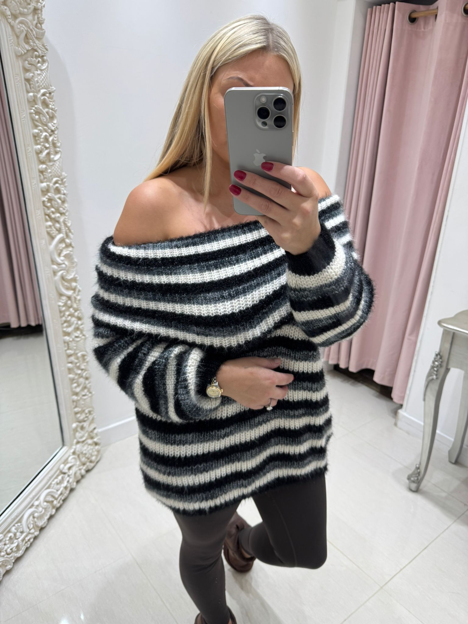 Sale Product form Deedee ~ Thick Knit Striped Bardot Soft Fluffy Jumper ~ Black & Grey £28.00 £16.00 Free pickup in our shop(s) 3 in stock Quantity Add to cart Guaranteed secure & safe checkout.