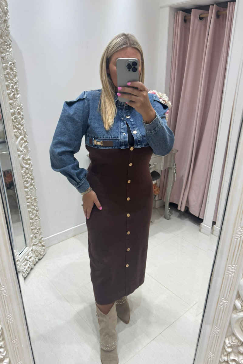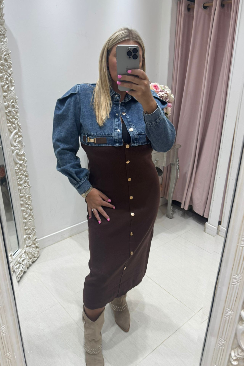 Product form Pretty Dollz Phoebe ~ Denim & Knitted Midi Dress ~ Dark Brown Denim and thick knitted fabric Mid length design Gold buttons Gold strap detail Structured Sleeves £40.00 2 in stock Quantity Add to cart Guaranteed secure & safe checkout.