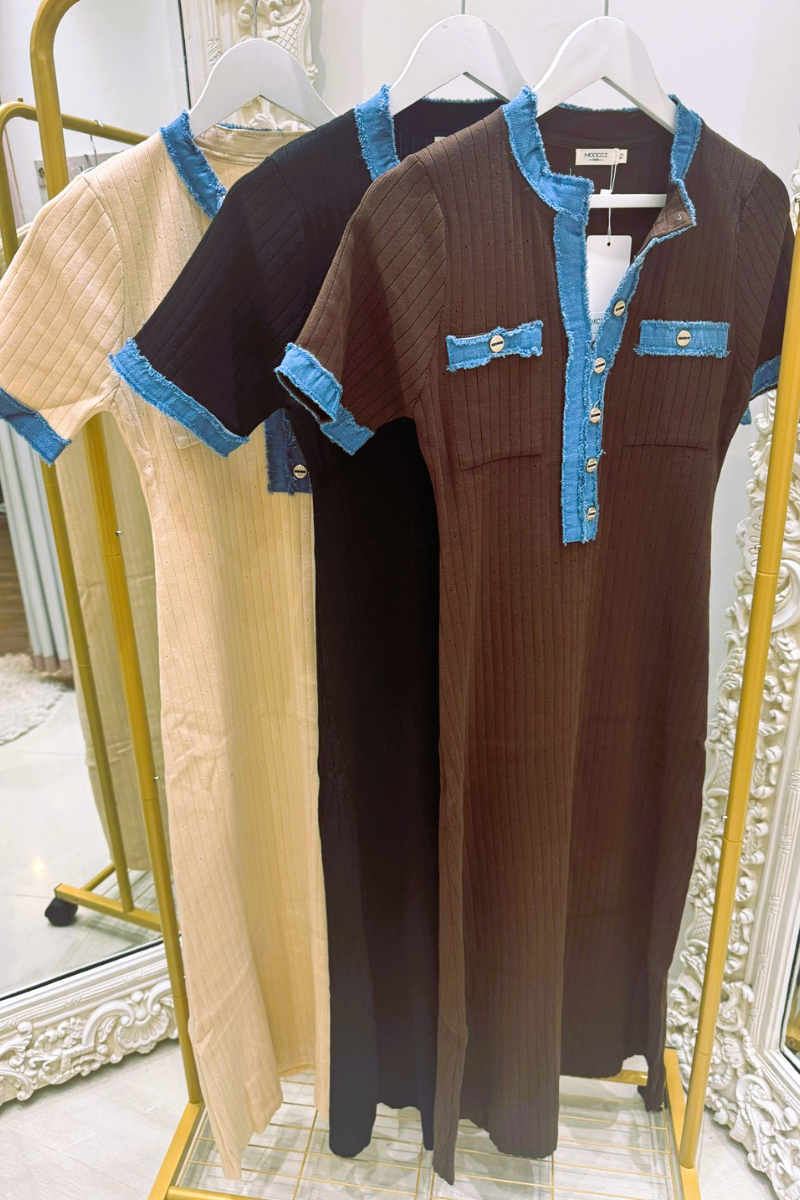 Polly ~ Thick Stretchy Ribbed Midi Dress With Denim Trim