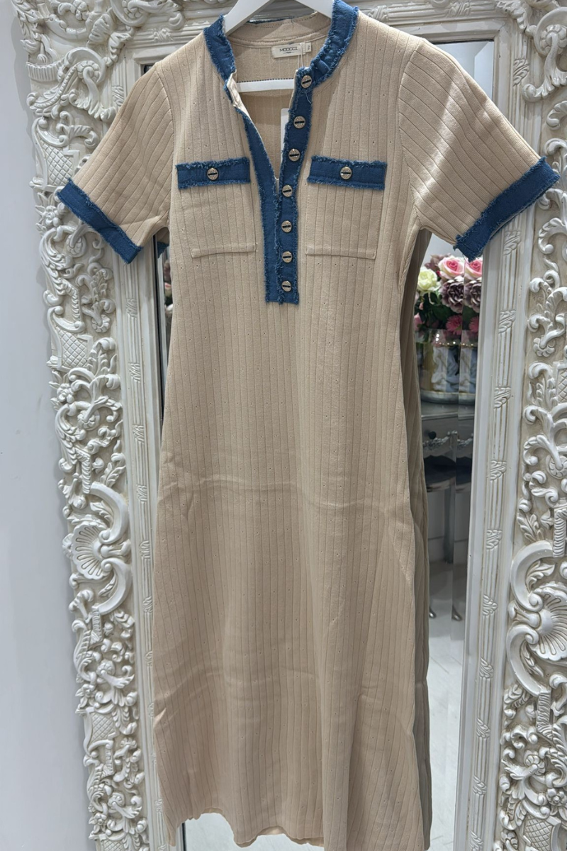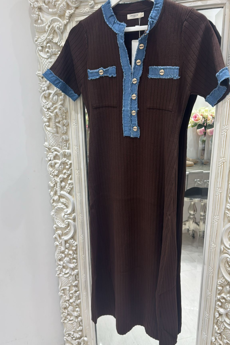 Thick and stretchy ribbed fabric midi dress with denim trim to neckline, pockets and cuffs. Gold Buttons One Size -...